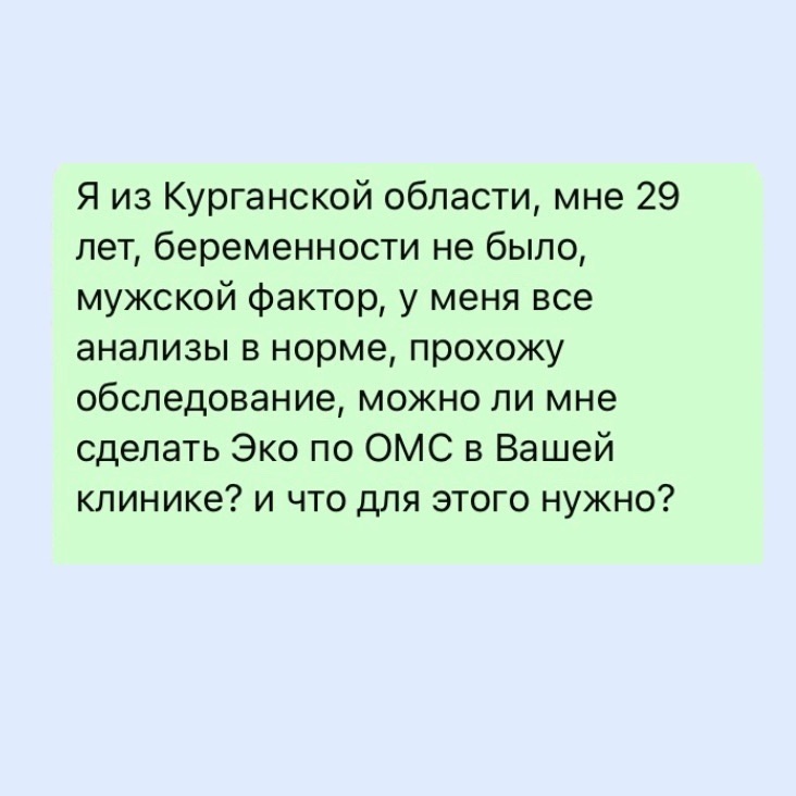 4. Если при проведении обследования будут выявлены описанные выше показания и не будет противопоказаний/ограничений, то со следующего менструального цикла уже можно провести ЭКО +ИКСИ по ОМС . 5. Записаться на прием к специалисту МЦРМ "Меркурий". Привезти с собой: • документ, удостоверяющий личность (паспорт), полис ОМС,