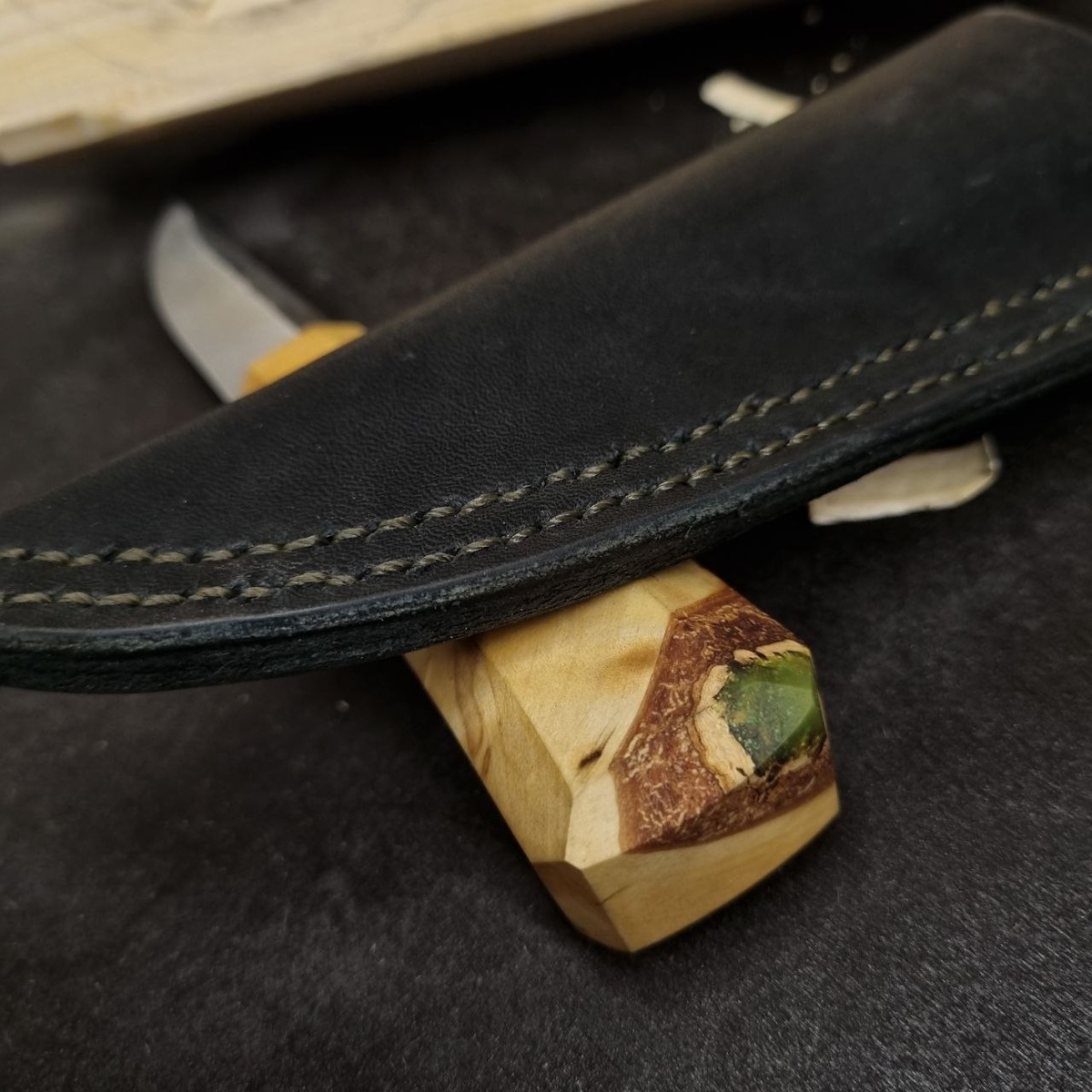 Над этим ножом я оооооочень старался. Хоть он и вышел очень простеньким, но труда вложено было много. Клинок я отковал из стали У8. Когда-то это был кусок старого напильника. Сложнее всего мне дались спуски у этого ножа - сначала я из выковал почти в ноль, а потом на гриндере свëл их в полный ноль. Можно сказать, что получились скандинавские спуски. Рукоять получилась из берёзового сувеля, наполовину залитого эпоксидной смолой. Я его припас уже очень давно именно на этот проект. Форму решил сделать гранëную, в попытке сохранить как можно больше древесины с красивой текстурой, а также эпоксидной смолы.