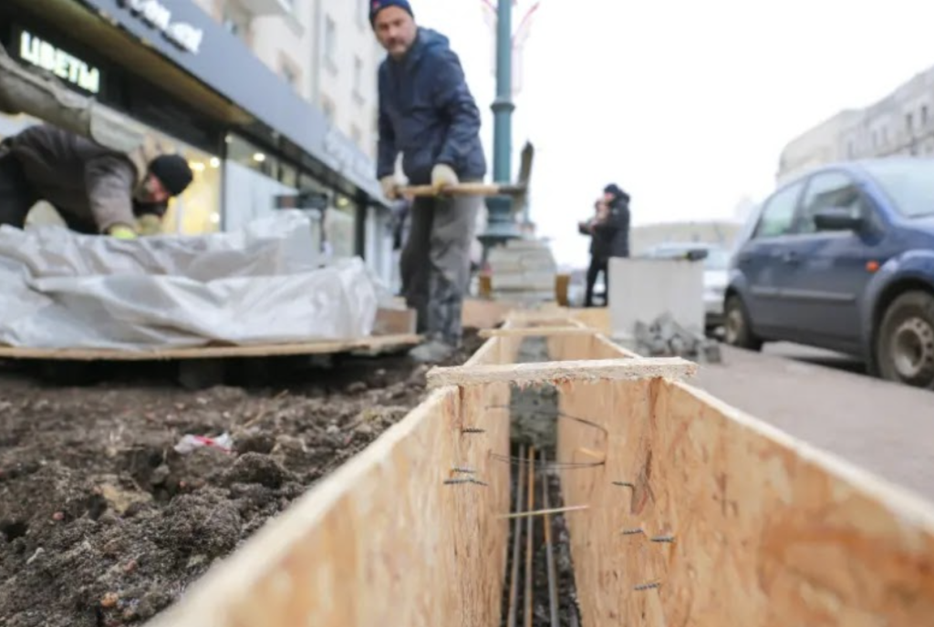 Сегодня специалисты залили железобетонный поребрик, таким образом расширив околоствольное пространство. Для этого по периметру лунок сделали деревянную опалубку. Она поможет сформироваться бетонной смеси и удержать ей. Когда цемент застынет, опалубку уберут. А монолитный железобетонный поребрик отшлифуют, закруглят кромки и обработают специальным раствором. Затем в готовые лунки добавят смешанный грунт, чтобы он был немного выше плиточного покрыти