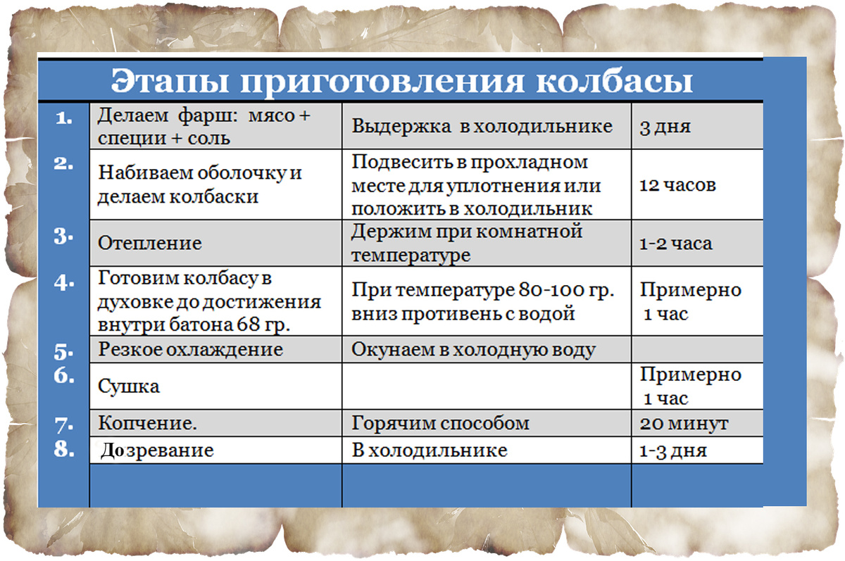 За основу взяла приготовление колбасы Ветчинной из свинины. Если учесть все выдержки мяса и потом колбасы, получается, что готовится колбаса будет целую неделю. Чтобы не запутаться, сколько дней или часов что выдерживать и в какой последовательности, составила для себя таблицу, ориентируясь на описание всего процесса в вышеуказанном рецепте.