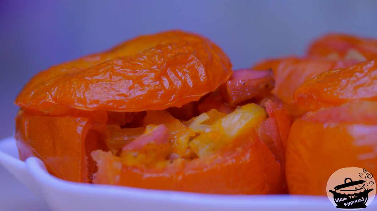 Ингредиенты: · томаты – 5 шт.; · сосиски – 4 шт.; · лук – 1 шт.; · петрушка – 4 веточки; · чеснок – 3 зубчика; · чёрный молотый перец – ½ ч.л.; · соль – ⅓ ч.л. Приготовление: у томатов срезать верх, аккуратно извлечь середину. Лук, петрушку, сосиски и сердцевину томатов мелко порезать, обжарить. Добавить соль и перец. Начинить томаты, накрыть «крышечками», запекать в предварительно разогретой духовке 20 минут при 180°С. Приятного аппетита!
