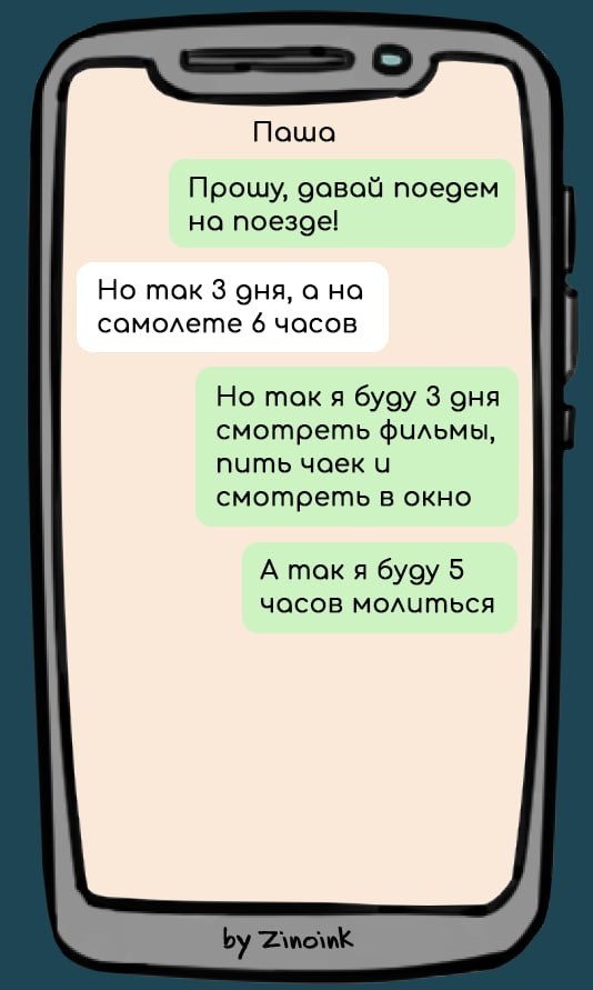 Впереди новогодние праздники и многие из нас отправятся в долгожданные отпуска, или в гости к родным и близким в дальние края. О том, на чем поехать, или полететь в целях экономии и комфорта и поговорим в сегодняшней статье. Я собрал 7 смешных переписок про средства передвижения. Уверен, они тебе понравятся. Приятного чтения и отличного настроения! Безусловно, чтобы сэкономить время, нужно всегда выбирать поездки на самолётах. А чтобы сэкономить нервные клетки?) Ответим в следующей переписке. Аэрофобия встречается у каждого третьего человека на планете Земля. Главное, чтоб этот третий не был тем, кому бояться самолётов – запрещено инструктажем). В тему – следующая переписка. Зимние приключения в компании друзей – это всегда прекрасно! Главное, чтобы все разделяли веселье. Увы, не то, что у некоторых нет такого желания. Нет банально – такой возможности! Личный транспорт – это не только про комфорт, но ещё и про большие затраты. Ведь, чтобы красиво ездить с кофе за рулём, нужно ещё и нех