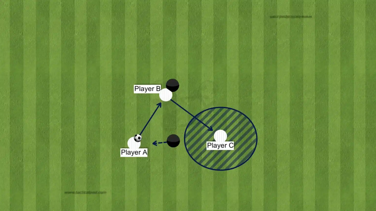 Игра на третьего, исходя из названия, предполагает работу трех футболистов, стремящихся взять линию обороны соперника. Представьте, что с мячом находится игрок А и он хочет передать его игроку С, который находится в свободной и более продвинутой позиции. Однако, противник сразу же заблокирует вариант прямой передачи от игрока А к игроку С. Чтобы доставить мяч конечному адресату, игрок А сначала передает мяч игроку В, который находится ближе и может в касание передать мяч игроку С. Одна лишняя передача, но зато сразу два игрока – прессингующие игрока А и игрока В – «отрезаны», а мяч стал ближе к штрафной соперника. Роль игрока В в этой комбинации очень важна, так как именно от его действий без мяча и на мяче зависит, получит ли игрок С мяч или нет.