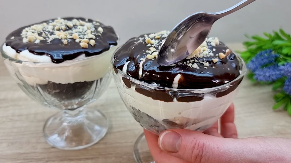 Этот вкусный и очень быстрый десерт не содержит яиц и муки. Вкус потрясающий! Готовится быстро и просто. Нежный, вкусный и сытный. Идеально для легкого завтрака, кто любит сладенькое. Можно добавить ягоды или фрукты. Ингредиенты: 6-8 штук печенья Орео; 50 г шоколада + 50 мл сливок (20%); 200 г маскарпоне; 1-2 чайной ложки сахарной пудры (по вашему вкусу); 100 мл сливок (20-30%); Способ применения: Печенье Орео покрошить небольшими кусочками и разделить в 2 креманки К маскарпоне добавить 1-2 чайной ложки сахарной пудры (по своему вкусу), 100 мл сливок (20-30%). Все хорошо перемешать миксером до устойчивых пико