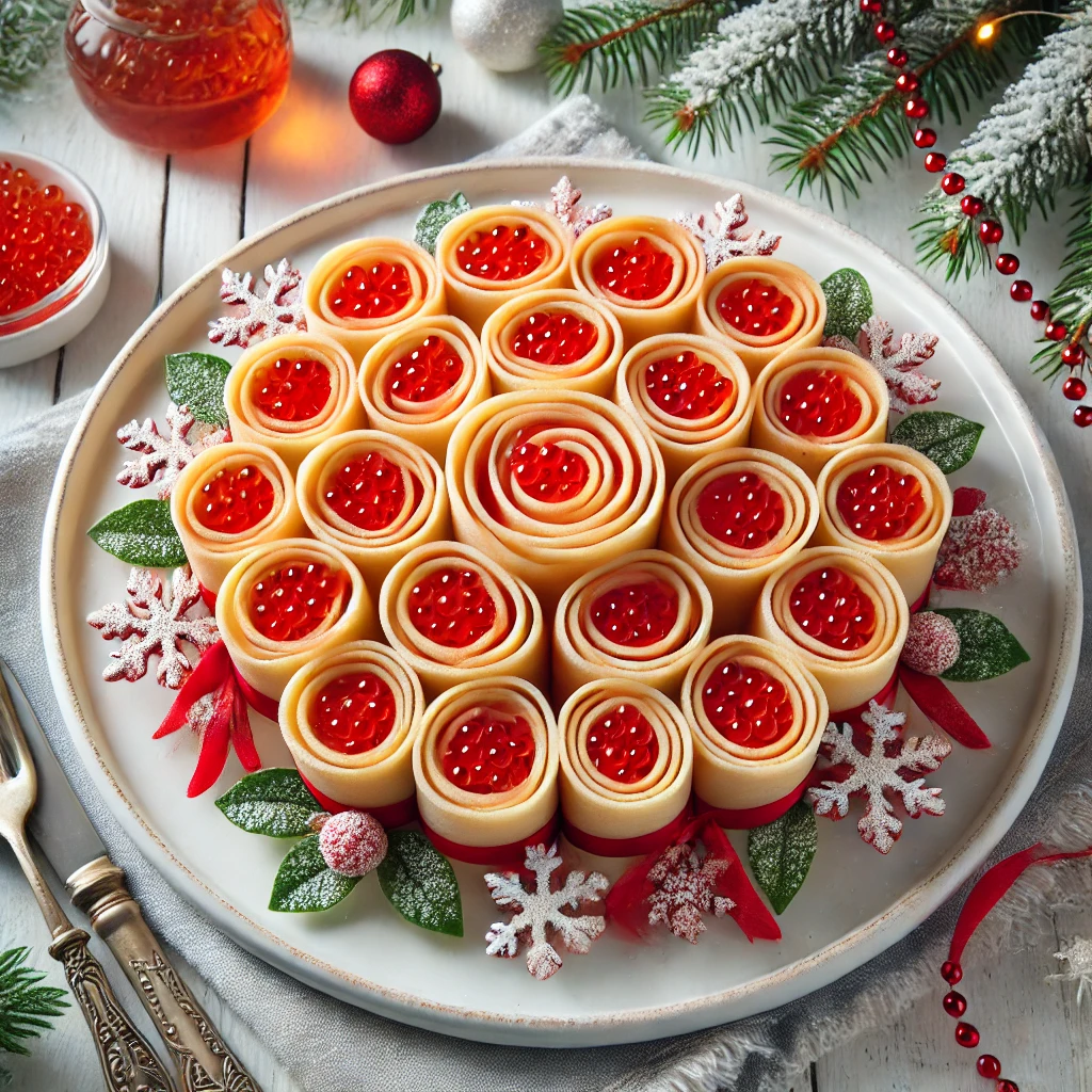 1. Блины с икрой в форме свёрнутых роз Ингредиенты: • Тонкие блины — 4 шт. • Красная икра — 100 г • Сливочный сыр — 100 г Как готовить: 1. Намажьте блины сливочным сыром. 2. Выложите тонкий слой икры и сверните в плотный рулет. 3. Нарежьте рулеты на кусочки и разверните края, чтобы получилось как роза. 2. Капрезе на шпажках в зимнем стиле Ингредиенты: • Мини-шарики моцареллы — 150 г • Помидоры черри — 200 г • Свежий базилик — 1 пучок Как готовить: 1. Нанизывайте на шпажки: помидор, листик базилика, шарик моцареллы. 2. Украсьте зелёным соусом (например, песто). 3. Фаршированные грибы с сыром и шпинатом Ингредиенты: • Шампиньоны крупные — 10 шт. • Сливочный сыр — 150 г • Шпинат — 50 г Как готовить: 1. Удалите ножки у грибов. 2. Смешайте сыр с нарезанным шпинатом, начините грибы. 3. Запекайте в духовке при 180°C около 15 минут. 4. Мини-тарталетки с креветками и манго Ингредиенты: • Тарталетки — 10 шт. • Очищенные креветки — 150 г • Манго — 1 шт. Как готовить