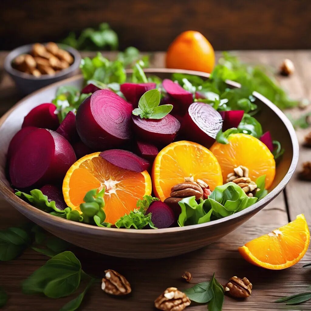 Ингредиенты: - 2-3 средние свеклы - 1 апельсин - 100 г грецких орехов - 1 небольшая красная луковица - 2-3 столовые ложки оливкового масла - 1 столовая ложка уксуса (по желанию) - Соль и перец по вкусу - Зелень для украшения (петрушка или укроп) ### Приготовление: 1. **Подготовка свеклы**: Отварите свеклу в кожуре до готовности (примерно 40-60 минут в зависимости от размера). Затем остудите, очистите и нарежьте кубиками или натрите на крупной терке. 2. **Апельсин**: Очищенный апельсин нарежьте на дольки, удалив все перегородки. 3. **Лук**: Красный лук нарежьте тонкими полукольцами. Если лук слишком острый, можно замочить его в холодной воде на 10 минут. 4. **Орехи**: Грецкие орехи слегка обжарьте на сухой сковороде до золотистого цвета, затем порубите. 5. **Сборка салата**: В большой салатнице соедините свеклу, апельсин, лук и орехи. Добавьте оливковое масло, уксус, соль и перец. Аккуратно перемешайте. 6. **Подача**: Подавайте салат к столу, украсив зеленью. Этот салат не только яркий