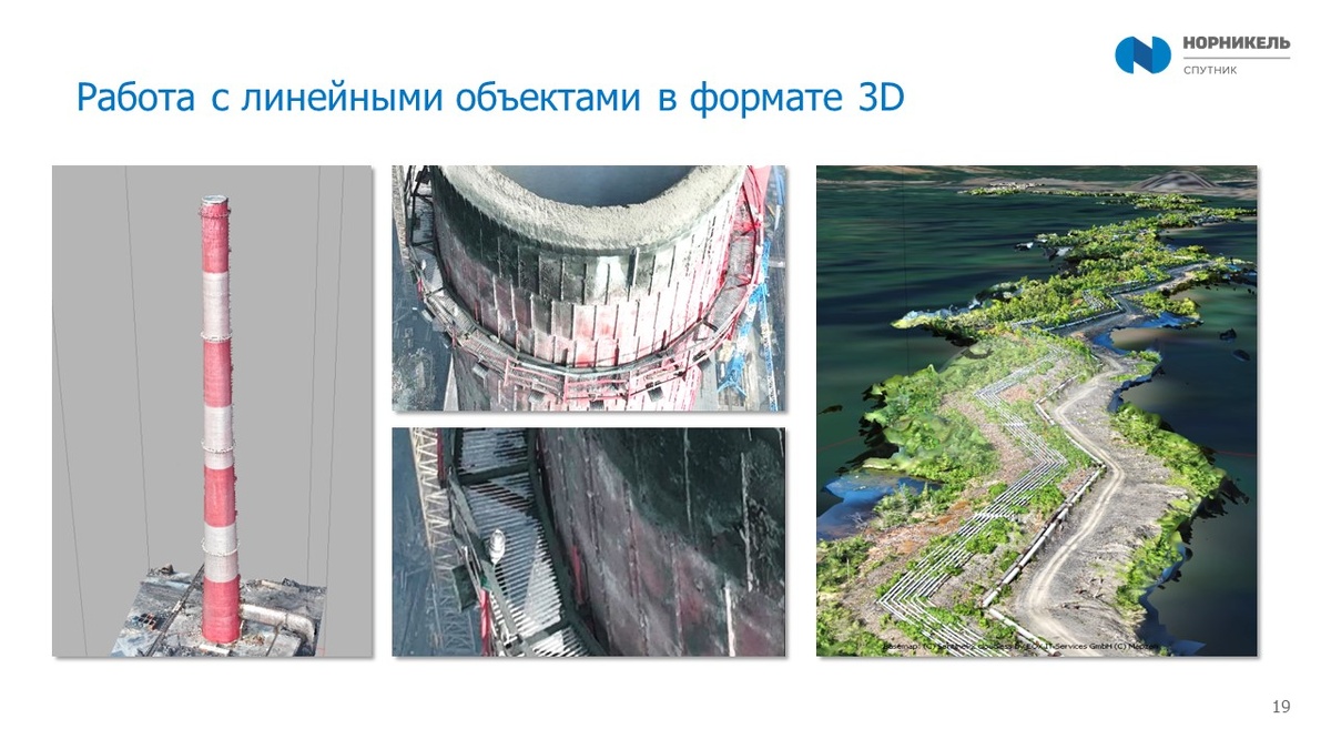 Одно из нововведений по использованию Беспилотных технологий в 2024 году стал переход ГК Норникель к использованию фотореалистичных 3D моделей для поиска дефектов и проведение контрольных измерений. Внедрение 3Д моделей стало следующим этапом после анализа видеосъемки высотных и протяженных объектов, которая, до этого, пришла на смену промышленным альпинистам (трубы сотой 250 метров) и визуальному осмотру гидротранспорта (протяженность более 30 км). Использование 3Д это: · Безопасность. · Объективность. · Гарантированность что работы были. · Возможность накапливать и анализировать архивные данные. · Точное позиционирование дефектов/интересующих мест с получением размеров и возможность наблюдения во времени изменений. · Работа почти в любое время года и широком диапазоне погодных условий. · Большой объем данных для анализа. · Возможность использования материалов различными службами. ООО «Беспилотные технологии» оперативно, качественно и с высоким уровнем детализации в течение 2024 год