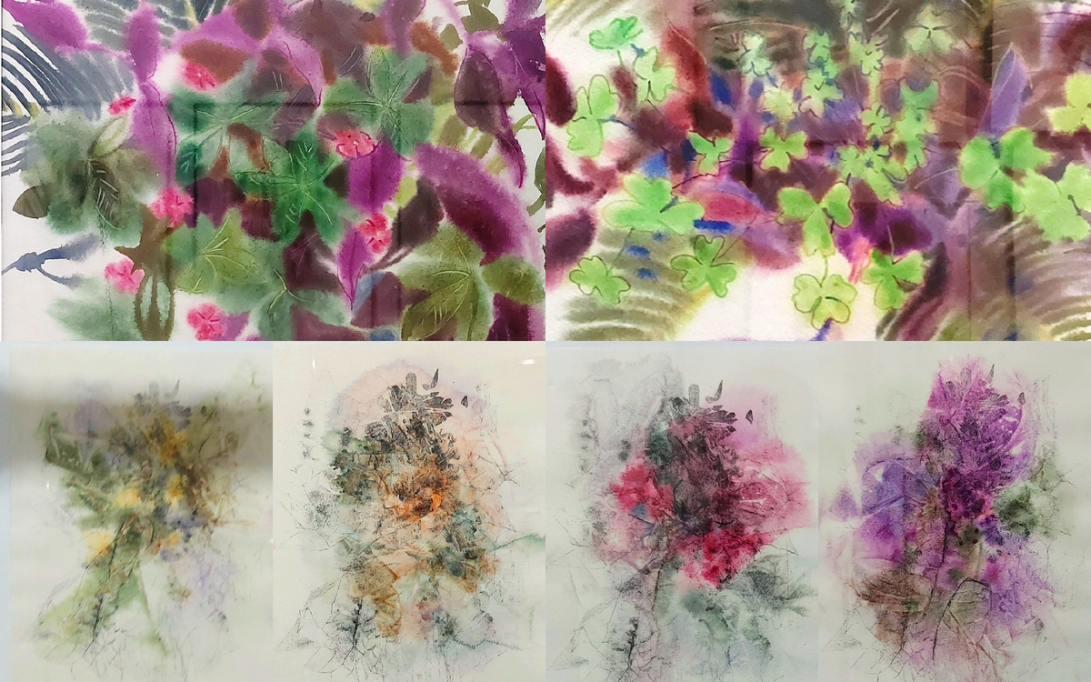 Картины выполнены в 2023 году в смешанной технике на основе акварели с наложением различных предметов.»