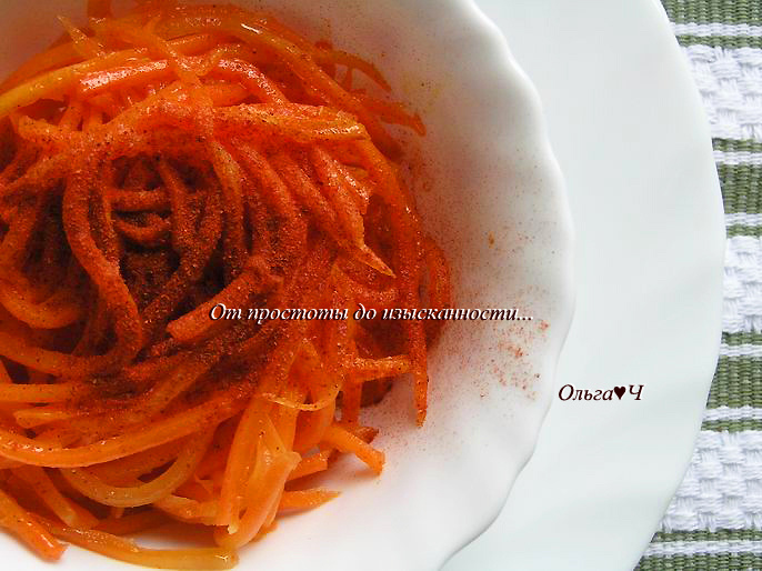 3 зубчика чеснока Приготовление: Морковь натрите на специальной терке, всыпьте сахар, перемешайте и оставьте на 30-60 минут при комнатной температуре. А пока разогрейте растительное масло и обжарьте нарезанный лук. Затем лук выньте из масла и влейте уксус. Лук используйте в другом блюде. К моркови добавьте все пряности и специи, влейте масло с уксусом, перемешайте. Добавьте измельченный чеснок, хорошо перемешайте. Оставьте морковь при комнатной температуре еще на 1-2 часа, периодически помешивая, затем охладите. Приятного аппетита! Вам также могут понравиться: