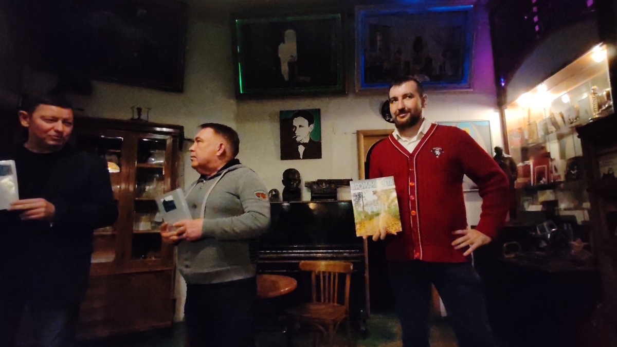 В литературном салоне Андрея Коровина главный редактор альманаха «Тула» Сергей Овчинников и составитель тульского выпуска «Роман-газеты» Александр Евсюков презентовали свои издания. Они и были соведущими вечера. Не в этот день, но, кстати, лишь совсем недавно я узнал, что «Роман-газета» выходит и поныне (а узнал об этом на вечере памяти поэта Соколова в доме Ростовых, где выступал главный редактор издания Юрий Козлов). Казалось бы, «Роман-газета» должна была бы остаться и осталась где-то в далёком советском прошлом, но она не просто существует, а довольно успешна: делает не только федеральные, но и региональные выпуски, в числе которых оказался и нынешний тульский. Через пару лет изданию стукнет 100 лет. Альманах «Тула» намного моложе — ему 24 года, всё это время главред Сергей Овчинников издаёт его на собственные средства. В этом году исполняется также 10 лет сотрудничества альманаха и литсалона: первый творческий вечер «Тулы» в Булгаковском доме состоялся в 2014 году. — Альманах