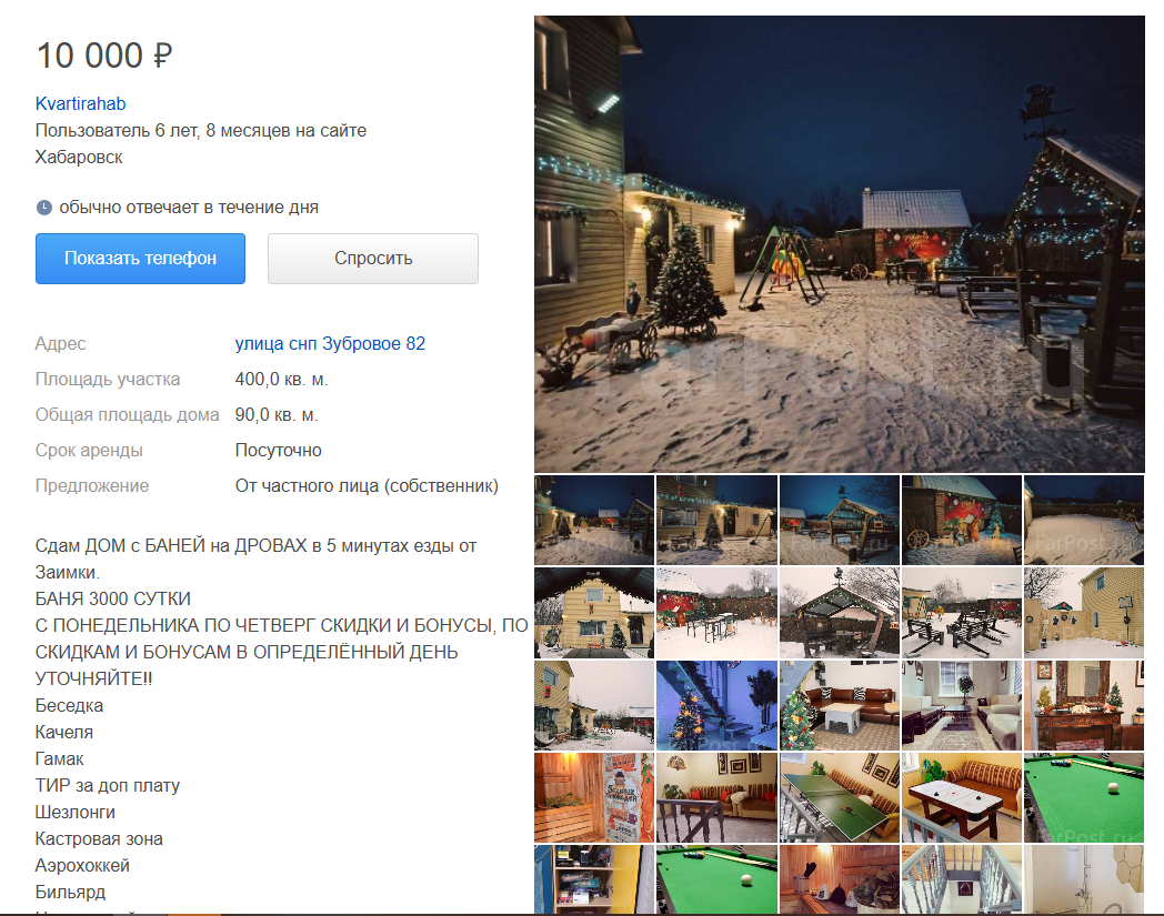 Аренда загородных коттеджей на Новый год и Рождество оказалась самым популярным способом проведения праздников среди хабаровчан. Свободных мест на главную ночь декабря уже не осталось. Несвободны и ближайшие даты. К примеру, снять дом с баней на дровах, что в пяти минутах от Заимки, получится не раньше 6 января. Места на новогоднюю ночь и первые числа наступившего года уже забронированы. Коттедж с банкетным залом, расположенный в городе (район 38-й школы), свободен 2 и 3 января. Дом вмещает до 55 человек, на территории есть вся инфраструктура для приятного отдыха как большой шумной компанией, так и семьей с детьми. - В вечернее время вас порадует светомузыкальная установка, также имеются телевизоры, DVD-проигрыватель, караоке. В будние дни вы можете приехать к нам с семьей, друзьями для приготовления любых блюд на мангале, тандыре или в казане. Аренда коттеджа зависит от дня недели и количества гостей, составляет от 15 000 рублей, - говорится в объявлении. Стоимость коттеджа на свободн