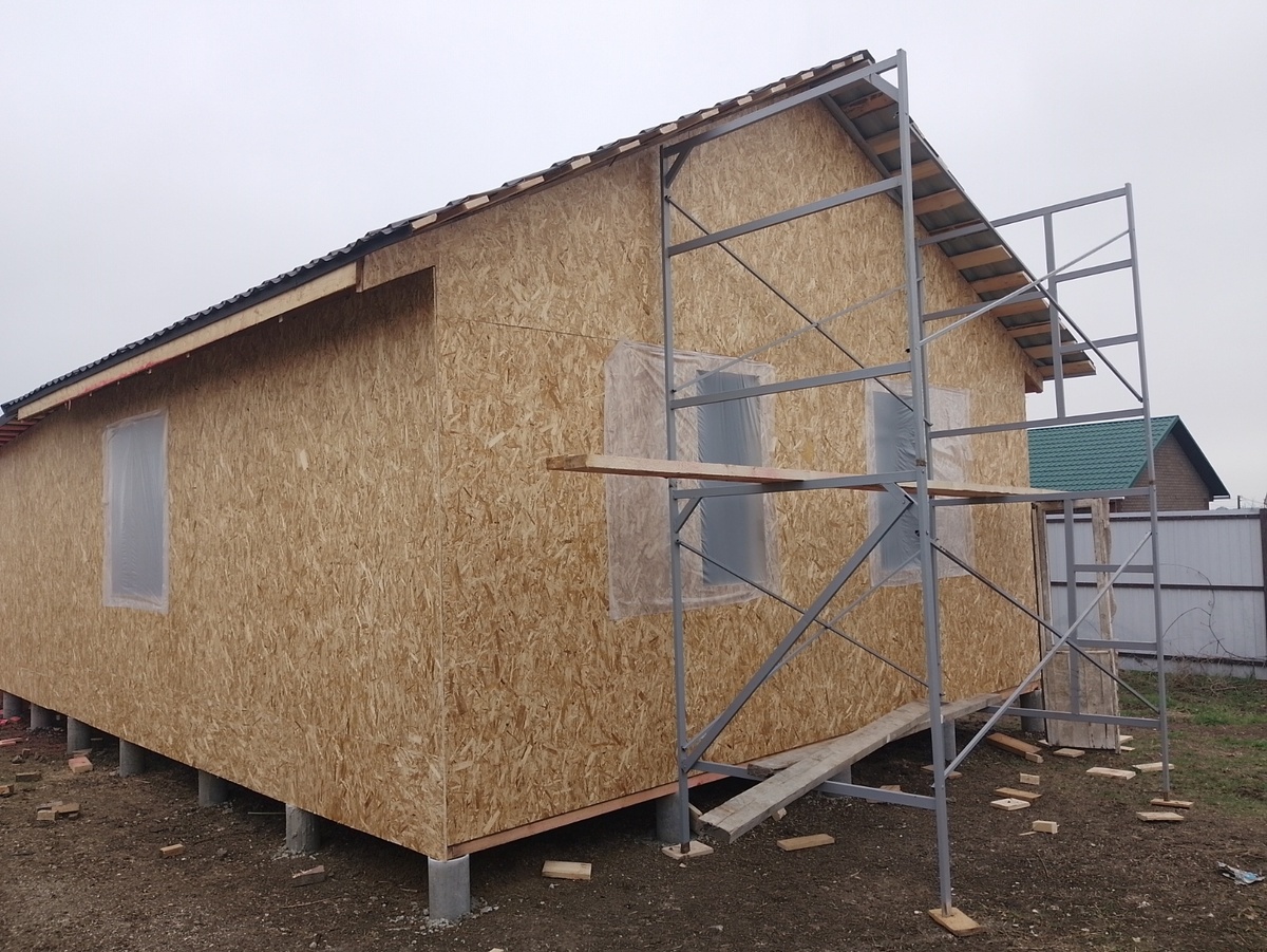 Здравствуйте! Все, наружная часть дома на данном этапе закончена. Окошко и дверка на чердак сделается потом. Теперь можно не переживать за каркас и начать внутреннее обустройство. Пока погода более менее не устаканится, к фасаду можно и не возвращаться. Только мусор, да дрова вокруг дома соберем. И начнем утепление. Окна кстати заказали. Компания, представитель Алютеха в Крыму, попутно занимается и окнами, вот у них и заказали пять наших окон, не Века, конечно, но на сорок тысяч дешевле, что на данном объекте важно. Заклеил пока окна полиэтиленовой пленкой, что бы сквозняк не гулял, все, можно заниматься полами. На пол, помимо пеноплекса, используем минеральную каменную вату. Три слоя утеплителя, для Крыма более, чем чем достаточно. Лаги сразу же расположили под утеплитель, так что даже не пришлось сминать или резать. На пол укладываем ту же ориентировочно стружечную плиту, только толщиной восемнадцать миллиметров. Раньше под фанеру делали контр бруски, паропроницаемую мембрану, да