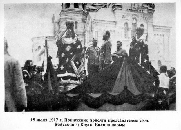 Открывая 26 мая 1917 года Большой казачий Круг, атаман Волошинов сказал: «Россия переживает трудные дни. Анархия растет. И казаки должны властно сказать: анархия была, но анархии не будет… Мы пойдем по пути спасения Родины, как шли в «смутные дни», как шли в 1812 году. История снова возложила на нас великую честь – спасти Родину».