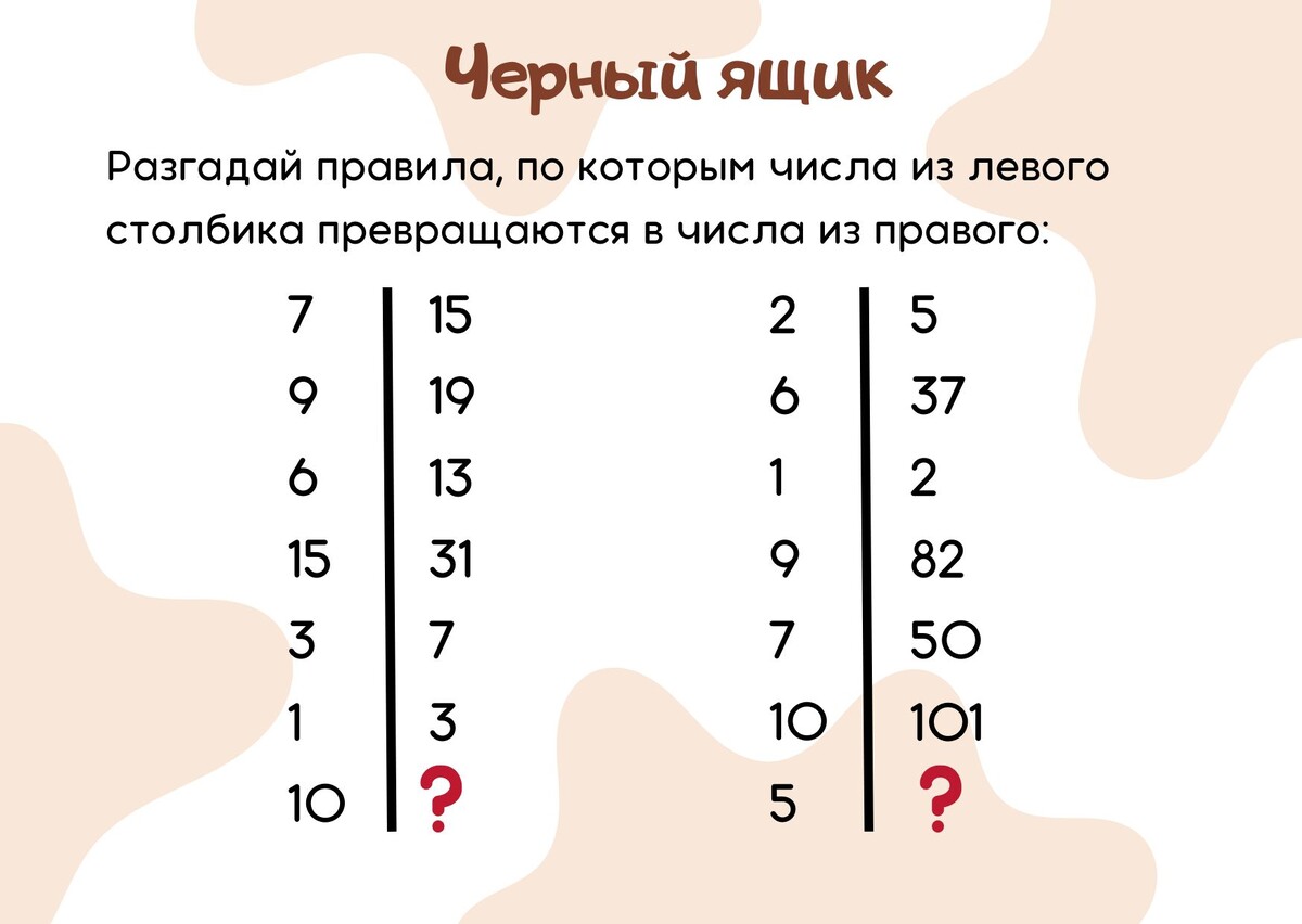 Сегодня речь пойдёт о замечательной математической игре, прелесть которой в неисчерпаемости игровых комбинаций, а значит играть в неё можно бесконечно. Более того, уровень ее сложности легко менять в соответствии с возрастом и способностями детей. Да и для взрослых она могла бы быть не менее интересна. Надеюсь, заинтриговала? Это математическая игра «Чёрный ящик». Я познакомилась с ней, будучи ученицей пятого класса. Наш педагог нарисовала на доске длинную вертикальную черту и сообщила, что эта черта - чёрный ящик, специальное устройство, которое превращает одни числа в другие, пользуясь определённым правилом. Важно, что число, если его опускать в чёрный ящик несколько раз, всегда будет превращаться в одно и то же число. При этом нестрашно, если несколько разных чисел превратятся в одно и то же. Наша задача заключалась в том, чтобы «опускать» числа в чёрный ящик (числа записывались слева от вертикальной черты). Учитель сообщала нам, во что "превращается" каждое из названных чисел. Побе