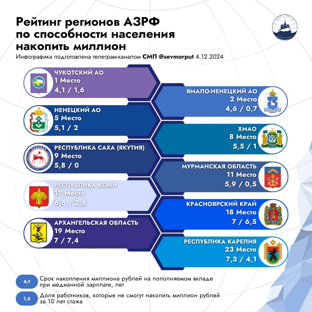 Национальным лидером среди регионов по скорости накопления денег стал Чукотский автономный округ — его жителям потребуется всего четыре года и один месяц, чтобы собрать миллион рублей, следует из рейтинга агентства «РИА Рейтинг». На второй позиции общефедерального списка ЯНАО — жители округа смогут отложить миллион рублей за четыре года и шесть месяцев. В топ-5 рейтинга также попал Ненецкий автономный округ, где соответствующий срок составляет пять лет и один месяц. Остальные арктические субъекты вошли в топ-25 национального рейтинга: ◾️ ХМАО: 8-е место, пять лет и пять месяцев ◾️ Республика Саха: 9-е место, пять лет и восемь месяцев. ◾️ Мурманская область: 11-е место, пять лет и девять месяцев. ◾️ Республика Коми: 17-е место, шесть лет и восемь месяцев. ◾️ Красноярский край: 18-е место, семь лет. ◾️ Архангельская область: 19-е место, семь лет. ◾️ Республика Карелия: 23-е место, семь лет и три месяца. Отметим, что список имеет корреляцию с доходным рейтингом, где в топ-3 также были ЯНА