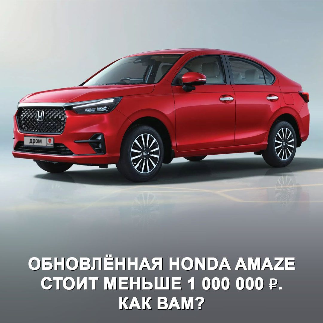 Это 4-метровая малолитражка для рынка Индии, где на автомобили таких габаритов существуют льготы. Под капотом — 1,2-литровый атмосферник на 89 л.с. (110 Нм), коробка — МКПП-5 или вариатор. Также доступен битопливный вариант (бензин и сжатый метан). Среди оснащения Honda Amaze — светодиодная оптика, цифровая приборка 7”, мультимедиа 8”, адаптивный круиз, функция контроля движения по полосе, шесть подушек безопасности, легкосплавные колёсные диски 15”. Цена по текущему курсу — примерно от 986 000 ₽. На нашем рынке такая модель пошла бы или слишком уж мала Honda? 🤔 #дромновость #индия #honda #amaze #седан