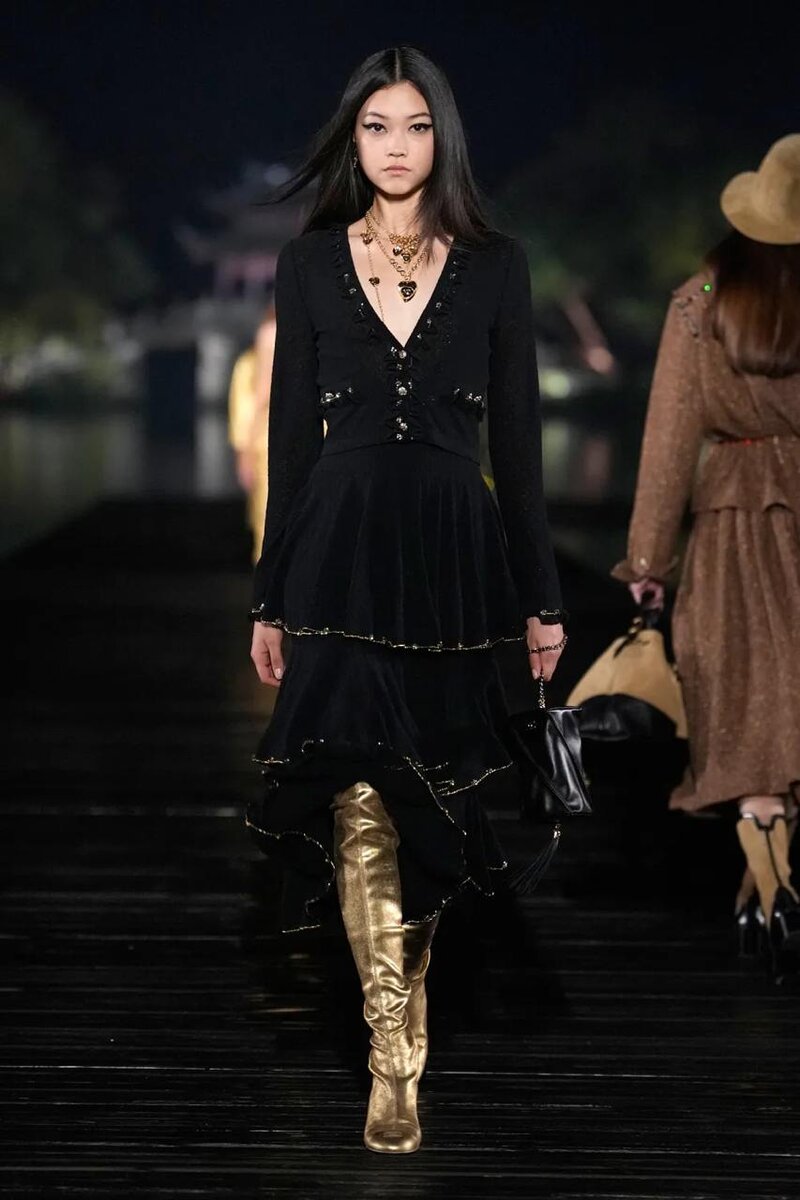 На днях французский модный дом Chanel представил коллекцию Métiers d’art pre-fall 2025 в китайском городе Ханчжоу. О том, как прошло шоу без креативного директора рассказываем в нашем материале Показ отдает дань Коко Шанель, восхищавшейся древним китайскими искусством. Дизайнер коллекционировала китайские ширмы в стиле коромандель — расписные, лакированные и уникальные. Они и послужили начальной идеей для пошива линии, которая была презентована в Ханчжоу. Коллекция действительно отсылает нас к китайской культуре. В линейке были представлены золотисто-желтый брючный костюм, платье-комбинация и ботфорты того же оттенка. Как известно, желтый в Китае относился к императорам. На костюмах, юбках и бомберах можно заметить цветочную вышивку и образы птиц – еще одна отсылка к стране. Традиционно в новой коллекции был представлен и твид. Чтобы создать линию Métiers d’art 2025, креативная студия Chanel обратилась за помощью к ателье вышивки Maison Lesage и Atelier Lognon — мастерской, которая вы