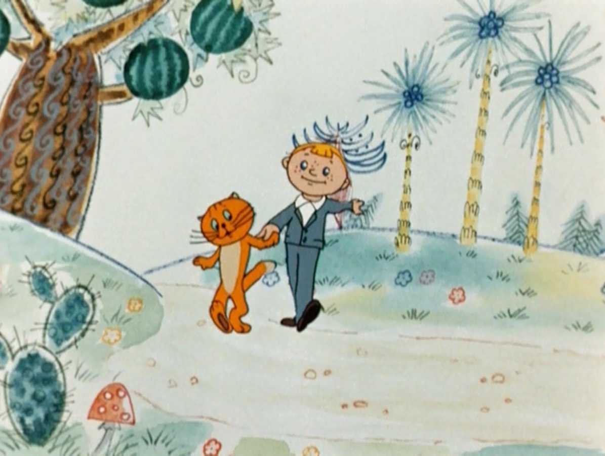- Волшебный помощник – кот Кузя – действительно помогает Вите в его походе: режет арбуз (имеет с собой нож!), делится с Витей, отвечает правильно на вопрос по арифметике, делится газировкой.