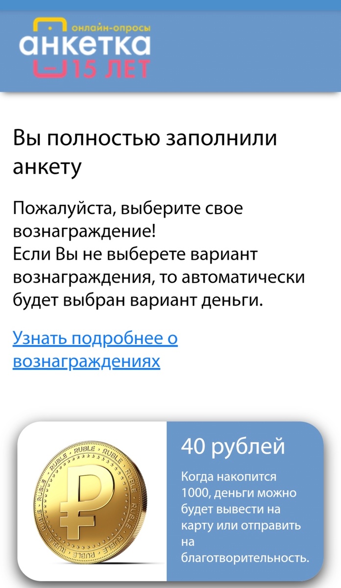 Ну бывает же такое? 👋 Только я вчера написала статью про опросник "Анкетка", что мол вот сама жду выплату) и мне к вечеру прилетел опрос на 40 рублей) И я его благополучно прошла за 5 минут. Совет всем 👇 На всех опросниках, не только на Анкетке, старайтесь отвечать честно и не забывайте, что вы писали при регистрации в анкете. А то часто бывает так, что вы пишите например, что вы директор, а при регистрации указали, что вы рабочий) И ждёте опросов... Пять минут и у меня 40 рублей и самое главное 1000 рублей на сайте, которую уже можно выводить на банковскую карту. Что я уже благополучно и сделала) Мелочь, а приятно! Так что, все те, кто говорит, что сайт не платит или не присылает опросы как у вас набралась сумма близкая к 1000 рублей, вы не правы! Сайт регулярно присылает опросы и явно ему нет дела до ваших сумм на опросник. Ну это я так думаю) Тут главное регулярно заходить на сайт и проходить бесплатные экспресс-опросы, которые видимо каким-то образом влияют на присылание