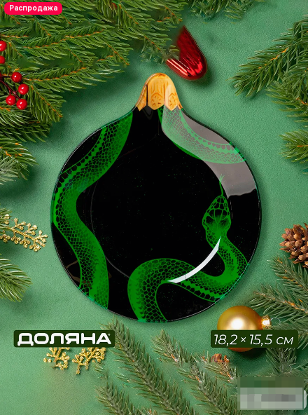 В форме ёлочной игрушке, с рисунком змеи, символом 2025 года.