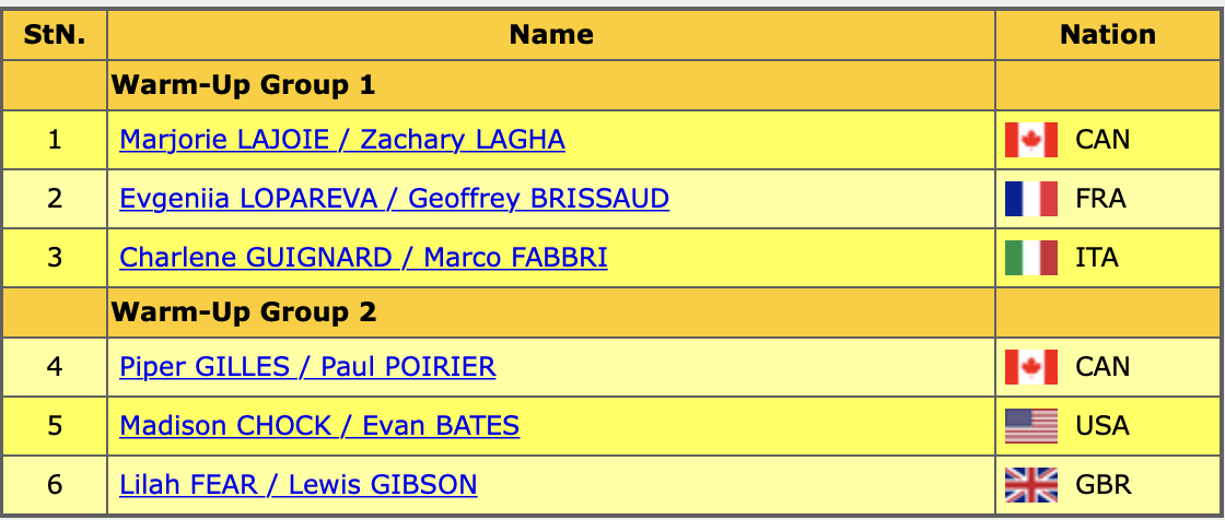 Список участников и порядок выхода на лёд: Дорожка шагов по средней линии - на 2 уровень у обоих. Твизлы на 4 уровень у обоих. Паттерн 3 уровня (повысили после пересмотра). Хорео секвенция исполнена хорошо. И в финале чистое вращение. Мне не нравится эта программа. И от темы Остина Пауэрса я уже устала. Не хватает харизмы этой паре, чтобы выкатывать такую тему. Результат РТ: 77.73 Твизлы на 4 уровень у обоих. Паттерн - на 1 уровень (понизили с 3 после пересмотра). Дорожка шагов 3 и 2 уровня. Поддержка на 4 уровень - исполнена хорошо. И в конце яркая хорео секвенция. Французы выделяются, и мне это нравится. Они по-хорошему странные. Произвольный танец гораздо интереснее, жду завтрашнего дня. Результат РТ: 76.98 Твизлы 4 уровня у обоих. Дорожка 3 уровня у обоих. Поддержка исполнена хорошо, на 4 уровень. Паттерн 2 уровня. И в конце хорео секвенция. Прокат уверенный чистый, мне хотелось бы видеть больше эмоций от них. Эта программа мне нравится. И вообще пара интересная: экспериментирует