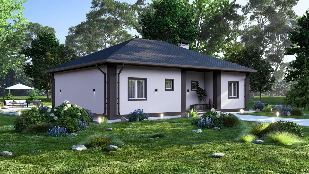 Небольшой одноэтажный дом в современном стиле. Несмотря на небольшую площадь в дом уместилось целых три спальни. Особым удовольствием станет момент, когда, стоя у мойки, можно будет любоваться пейзажем через дополнительное окно, ведь оно предназначено для создания максимального визуального комфорта. Стоимость строительства такого дома 15 294 104 руб. Что входит в стоимость. Этап 1. Документация: - Геодезические изыскания. - Геологические изыскания. - Позиционирование дома на участке. - Предоставление типового проекта с разделами АР, КР, ИОС. - Адаптация проекта под местные условия. Этап 2. Строительные работы: - Земляные работы (котлован). - Устройство дренажа и отведение воды от подошвы фундамента. - Возведение здания с наружной и внутренней отделкой до комплектации "серый ключ" из доступных типовых материалов.