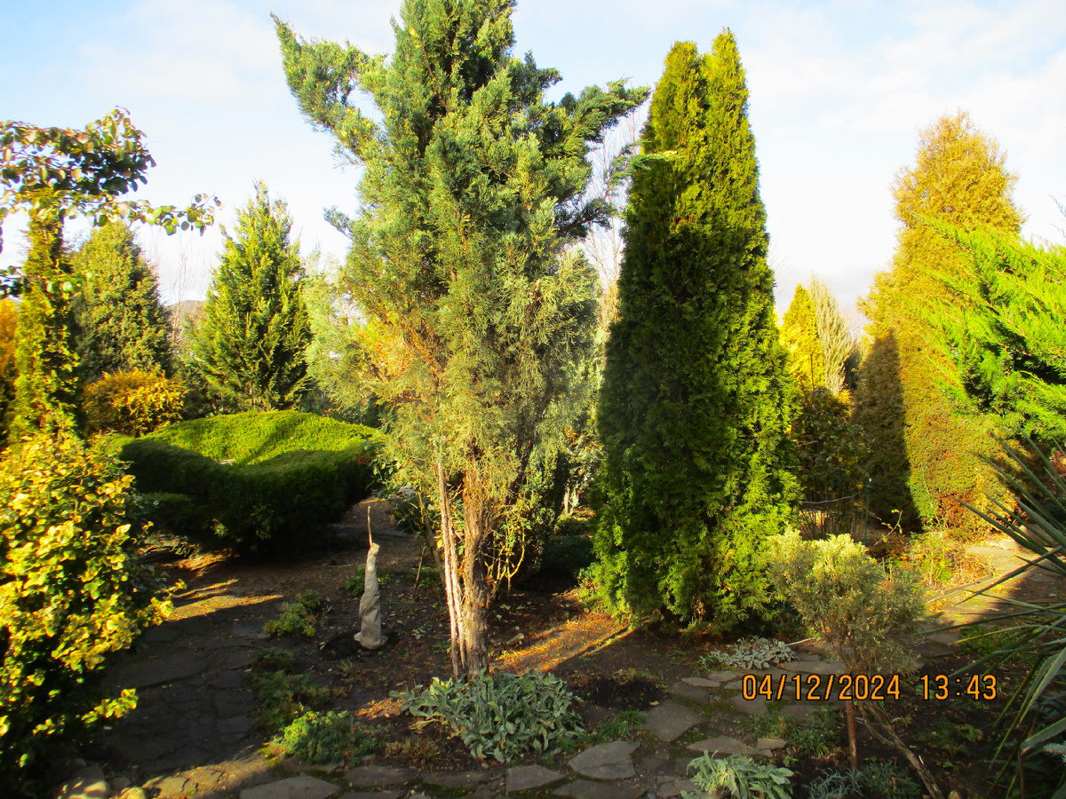 Самый большой в саду- можжевельник виргинский видовой. С листьями скумпии и барбарисы разных сортов.