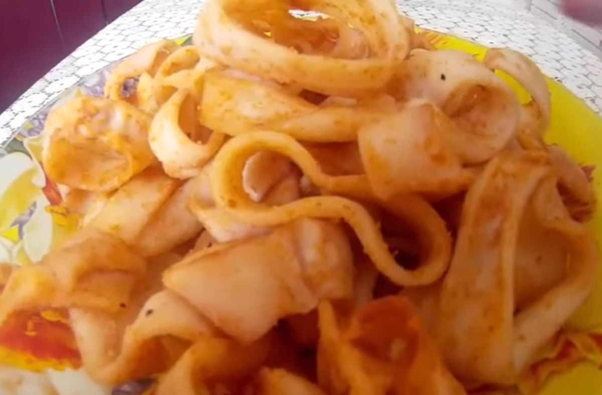 Здравствуйте, уважаемые подписчики и гости моего канала! Сегодня пятница, а значит, по сложившейся традиции, сегодняшняя статья будет посвящена очередному рецепту. И готовить мы сегодня будем супер вкусные чипсы из кальмара. В магазине можно купить свежемороженые, чищенные (потрошеные) тушки кальмаров, без щупальцев, по довольно-таки доступной цене. После того, как кальмары оттают, промываем их под проточной водой и соскабливаем ножичком красноватую пленку с них. После такой обработки они выглядят следующим образом: Теперь нам нужно эти тушки нарезать кольцами. Хвостовые части тушек кальмара отрезаем и убираем. Их можно будет пустить на приготовление салата. А остальную, трубчатую часть тушки, нарезаем на кольца шириной от полутора до двух сантиметров. Теперь, после того, как все кальмары порезаны на кольца, нам нужно их посолить, поперчить красным перцем, добавить растительного масла (лучше оливковое) и всё это тщательным образом перемешать. Солим и перчим по своему вкусу. Если делает