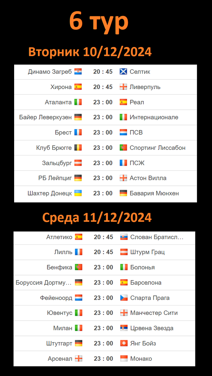 Кто сыграет в 6 туре Лиги Чемпионов? 10 декабря (вторник) Динамо Загреб - Селтик Жирона - Ливерпуль Аталанта – Реал Байер – Интер Брест - ПСВ Брюгге – ПСВ Зальцбург – ПСЖ Лейпциг – Астон Вилла Шахтёр – Бавария. 11 декабря (среда) Атлетико – Слован Лилль – Штурм Бенфика – Болонья Боруссия – Барселона Фейеноорд – Спарта Ювентус – Манчестер Юнайтед. Милан – Црвена Звезда Штутгарт – Янг Бойз Арсенал - Монако