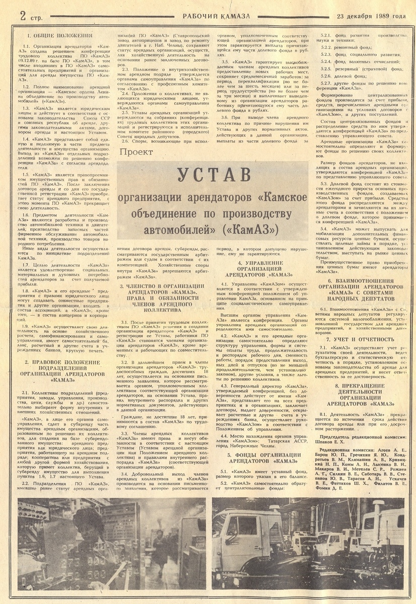 9 декабря 1989 года решением конференции трудового коллектива была создана организация арендаторов производственного объединения «КАМАЗ». В газете «Рабочий КАМАЗа» от 23 декабря 1989 года был опубликован Устав этой организации. Арендаторы КАМАЗа – это взращенные «перестройкой» кооператоры. Первые кооперативы в городе Набережные Челны были созданы в марте 1987 года. К декабрю 1987 года их было – 47, а к концу 1988 года – уже 363 кооператива, в которых работало 5 915 человек. На КАМАЗе к 1 января 1989 года было создано 116 производственных кооперативов. В начале того же 1989 года на автозаводе был создан Совет по работе с кооператорами, который возглавил Кондратьев Виктор Михайлович - начальник юридического отдела КАМАЗа. Внизу, как пример, заметки из газеты «Рабочий КАМАЗа» от 21 декабря 1988 года, рассказывающие о первых кооперативах - камазовских арендаторах. На станкостроительном заводе (Для справки. В период с 1986 по 1996 год ремонтно-инструментальный завод был разделён на инструме