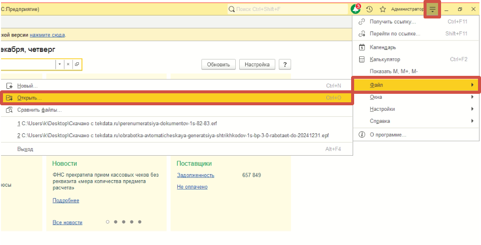 Для того чтобы воспользоваться обработкой, её необходимо открыть в программе 1С. Для этого в меню Сервис и настройки выбираем Файл и далее Открыть:
