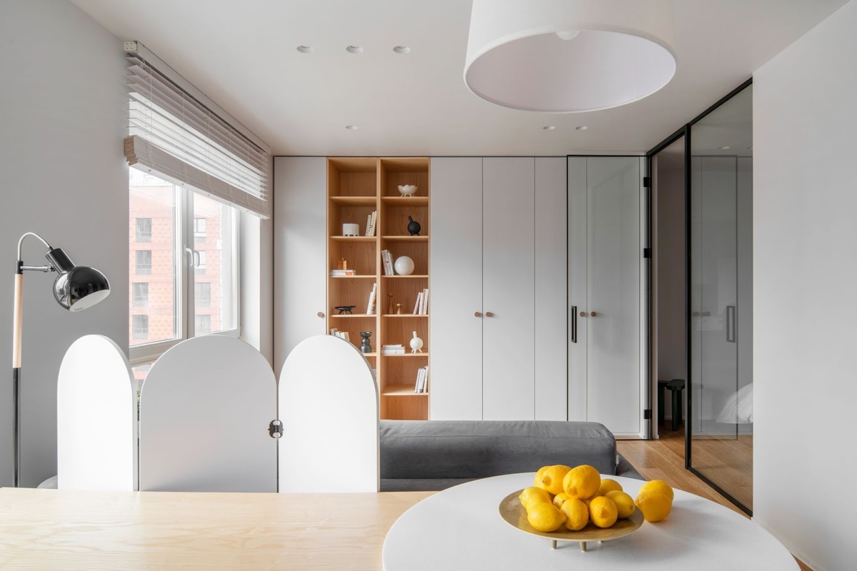 Вопрос с хранением в этой маленькой квартире решили с помощью шкафа во всю ширину гостиной — для этого пришлось отказаться от привычной ТВ-тумбы. Фасады шкафа заказали в цвет стен, чтобы максимально «растворить» мебель в пространстве и замаскировать массивность шкафа. Место для телевизора все же нашли: его ставят на треногу напротив дивана Саннес от divan.ru.