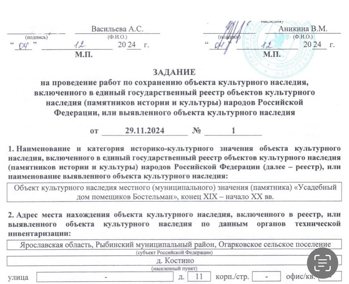 Имеем все шансы попасть в историю как не самые приятные «клиенты» для гос служащих 😀 Мы писали уже ранее целые опусы про всякие кадастровые походы, как мы делили комплекс зданий, как мучалась сотрудница МФЦ, потом - РосКадастра, как Наталья Сергеевна из местной администрации выписывала десять постановлений на присвоение адресов на каждое здание. Самая свежая задачка от нас уже по части документов, связанных с сохранением Усадебного дома, прилетела в управление архитектуры Рыбинского района. 14 ноября мы направили заявление на выдачу задания на реставрацию (раньше у нас было задание на ремонт), вчера мы его получили. Без него нельзя готовить документы для работ. Если вы приглядитесь к номеру задания… Мы первые. Первые не просто в этом году, а вообще первые в районе. Специалист Анастасия разбиралась в новой для себя теме работы с памятниками. И могу сказать, что это не последнее обращение по Усадьбе 😊 скоро наши реставраторы придут за разрешениями на шурфы и зондажи. 🌲🌲🌲 Пуст