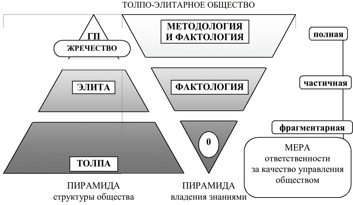 Я – царь, а все остальные в пирамиде власти толпо-элитаризма мои подчинённые, что создаёт более устойчивую и быстродействующую схему структурного управления, когда управленческие знания чётко распределяются по пирамиде власти но не доступны для всех.