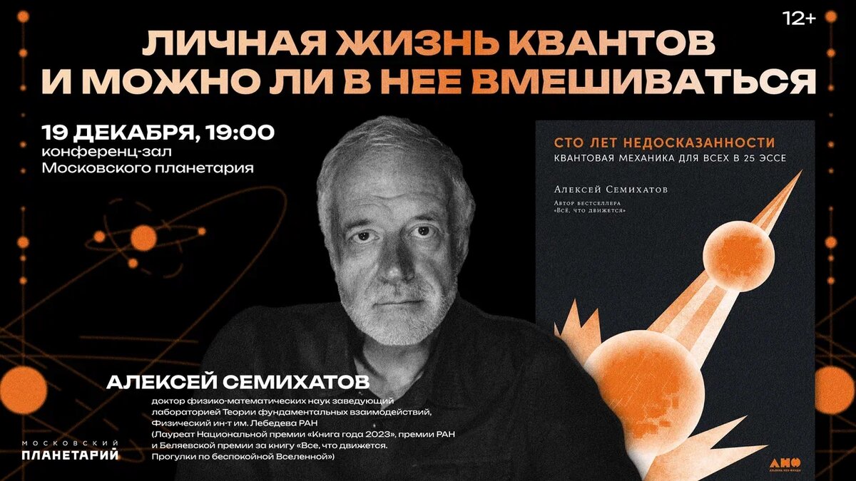 ⭐️ 19 декабря в Московском планетарии пройдет лекция Алексея Семихатова - «Личная жизнь квантов и можно ли в нее вмешиваться».