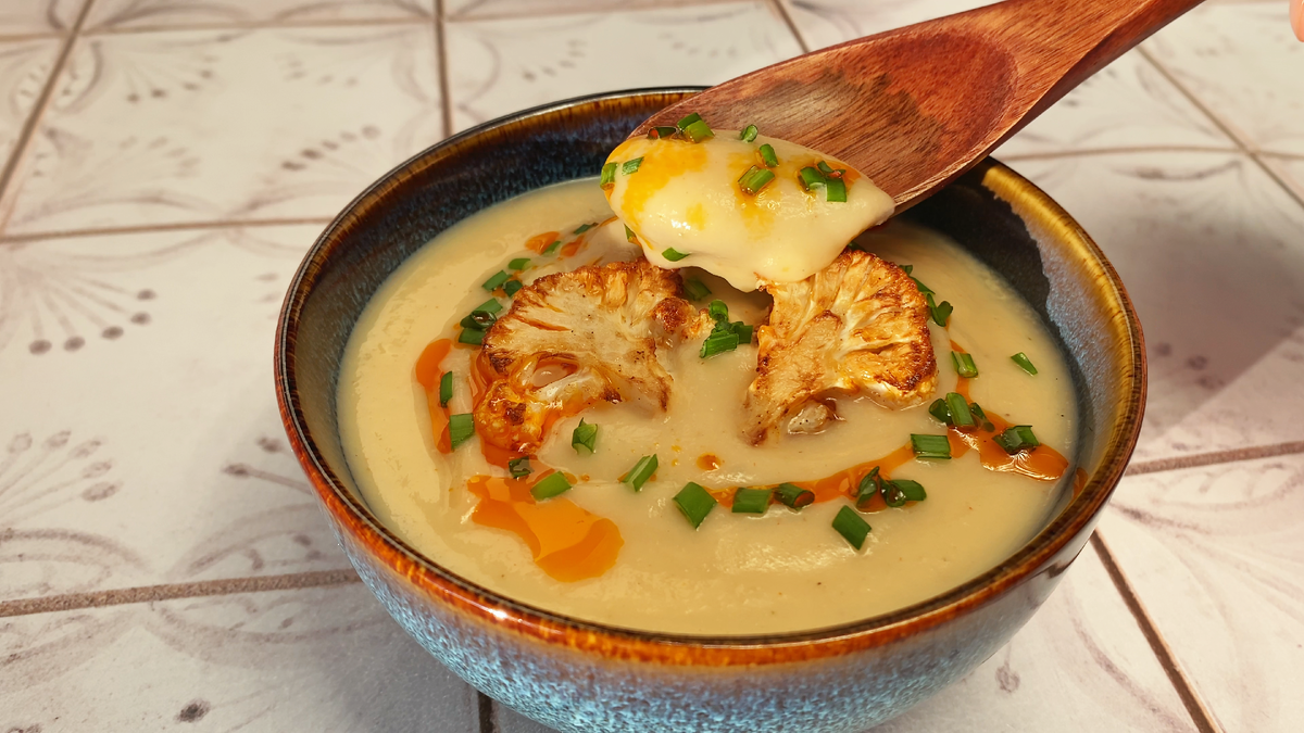 9. Готовый суп-пюре разлейте по порционным мискам и украсьте: на верх выложите пару поджаренных кусочков цветной капусты, сбрызните маслом чили и мелконарезанным зелёным луком. Подавайте с поджаренным до золотистой корочки хлебом.