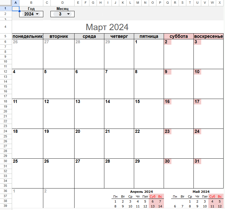 это таблица, которая позволяет вам создать страницу планировщика на любой месяц практически любого года. Можно дублировать рабочий лист планировщика, чтобы у вас был отдельный месяц на разных вкладках. Просто щелкните правой кнопкой мыши на вкладке рабочего листа Планировщика, выберите «переместить или скопировать...», установите флажок «копировать...», нажмите «ОК», а затем переименуйте новую вкладку в Январь, Февраль и т. д. Затем вы можете вводить праздники, события и дни рождения непосредственно в ежемесячный планировщик. ссылка на таблицу ежедневник Месяц Другие ежедневники https://sites.google.com/view/netkredo/%D0%BA%D0%B0%D0%BB%D0%B5%D0%BD%D0%B4%D0%B0%D1%80%D0%B8