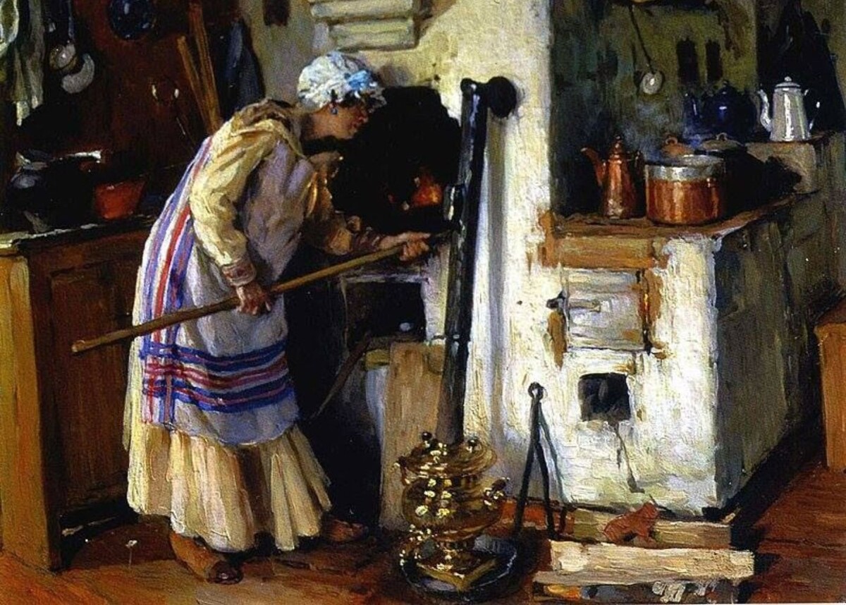 Жена должна «…востав от ложа своего, и очистив себя, и молебная совершив, и слугам дело указати… и что работа дневная: ести варити, и которой хлеб печи, сетней, или решетной, — и сама бы знала, как мука сеяти, как квашня притворити, и замесити и хлебы валяти, и испечи квасны и бухоны, и выпеклися, и колачи и пироги тако ж».