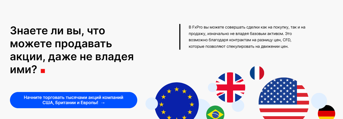 В таких условиях оптимальным кажется вариант покупки акций иностранных компаний через производные инструменты у лояльных для россиян и надёжных зарубежных брокеров с мировым именем. Например, у европейского брокера FxPro.