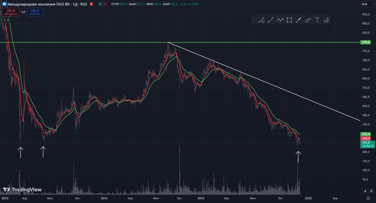 #ВК #VKCO Если смотреть масштабно, то ВК торгуемся на дне, которое свет еще не видел)) Можно предположить, что увидим отскок, но тут нужно иметь в арсенале несколько положительных факторов, таких как ключевая ставка, хорошее положение дел в компании и т.д. Но чисто технически мы можем сыграть на том, что тестируем дно. Смотри нижний график. Локально мы идем в нисходящем канале, где вышли в зону перепроданности и бумага подтвердила уровень сопротивления. Кстати канал, который я построил не совсем правильный, поскольку построен по двум минимумам и одному максимуму, что характерно только восходящему каналу. Но тем не менее, в данный момент, чтобы нам торговать от длинной позиции или набирать позицию хотя бы в среднесрок, то необходимо пробивать зоны сопротивления, указанные на графике. По сути это вершинки нисходящего движения, которые нам надо пробивать и тестировать сверху. Тогда есть вариант набрать позицию. А пока сетапов нет на покупку. Шортить инструмент не хочу. Не является индивид