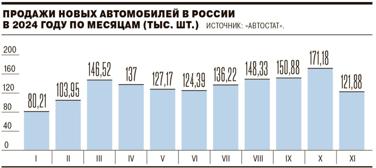 Автомобильный рынок России в ноябре обвалился на 29%, по сравнению с октябрём. Продажи снизились у большинства автопроизводителей, включая даже самых популярных, таких как Лада, Haval, Changan, Geely, Chery. Но в целом по 2024 году статистика по продажам весьма неплохая, так как за 11 месяцев 2024 года в России было продано 1 447 841 новых автомобилей, а это больше, чем за весь 2023 год. В 2023 году за весь год удалось продать 1,06 млн. автомобилей. Если продажи в декабре не обвалятся в 2 раза, то вполне вероятно, что в 2024 году будет продано больше автомобилей, чем было продано в 2021 году, который считался лучшим по продажам за последние годы. В 2021 году было продано 1,54 млн. новых машин. Как можно увидеть на схеме, изображённой выше, лучшими месяцами по продажам в 2024 году были сентябрь и октябрь, а худшим январь. Но январь-февраль, как правило, всегда глухие месяцы. Продажи в марте 2024 года существенно выросли, так как ряд китайских автопроизводителей в феврале-марте существе