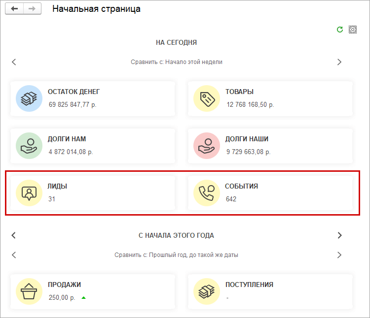 - Оборотные (за период): новые лиды, новые контрагенты, новые события, новые задачи,