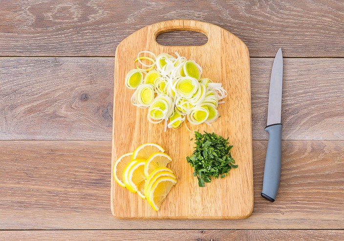Разогрейте духовку до 180°С. Лимон нарежьте тонкими полукружками. Лук-порей нарежьте тонкими кольцами толщиной 2 мм. Петрушку вместе со стеблями нарубите мелко. Рыбу посолите и поперчите внутри и снаружи, начините половиной лимона, луком-пореем и веточками тимьяна. В миску влейте 5 ст. ложек оливкового масла, добавьте половину нарубленной петрушки и перемешайте. Противень застелите пергаментом, на него выложите рыбу. Плавники, хвост и нос рыбы сбрызните оливковым маслом и оберните фольгой. Смажьте рыбу половиной оливкового масла с петрушкой с помощью силиконовой кисточки и поставьте запекаться в разогретую духовку на 55 минут. Затем достаньте противень из духовки, обмажьте рыбу оставшимся маслом с петрушкой и запекайте в духовке ещё 5 минут. 55 мин Картофель тщательно помойте, положите в большой сотейник с кипящей подсоленной водой и варите при лёгком кипении в течение 20 минут до готовности. Чеснок раздавите, очистите и нарубите мелко. Слейте воду с картофеля, картофель разрежьте попе
