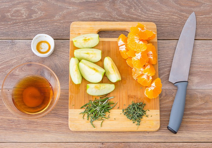 Шаг 1 Разогрейте духовку до 180°С. Яблоко очистите от семян, мякоть нарежьте дольками. Мандарины очистите и разберите на дольки. Чеснок раздавите и очистите. Листочки тимьяна и розмарина отделите от стеблей. Для приготовления соляного раствора в миску влейте 100 мл воды и соевый соус, всыпьте 1/2 чайной ложки соли и перемешайте. Соляной раствор наберите в шприц. Шаг 2 Утку посолите и поперчите изнутри и снаружи. Смажьте утку изнутри 1 ст. ложкой оливкового масла и начините дольками яблока, мандаринами, половиной листочков розмарина и тимьяна, добавьте половину чеснока и палочку корицы, скрепите отверстие шпажками. Введите соляной раствор из шприца в бёдра и грудку утки. Шаг 3 Оберните фольгой кончики крыльев и ножек утки. Утку выложите на противень, смажьте оливковым маслом с помощью силиконовой кисточки и поставьте запекаться в разогретую духовку на 1 час 5 минут. 60 мин Шаг 4 Картофель и лук очистите. Лук нарежьте крупными дольками. Картофель нарежьте крупными ломтиками. В чистую мис