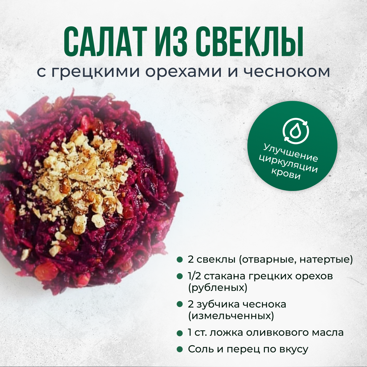 Этот салат помогает улучшить циркуляцию крови благодаря антиоксидантам в свекле и полезным жирам в орехах. Ингредиенты: 2 свеклы (отварные, натертые) 1/2 стакана грецких орехов (рубленых) 2 зубчика чеснока (измельченных) 1 ст. ложка оливкового масла Соль и перец по вкусу Инструкция: Смешайте натертую свеклу, орехи и чеснок в миске. Добавьте оливковое масло, соль и перец, аккуратно перемешайте. Изюминка: Подавайте с небольшим количеством лимонного сока для яркости вкуса. Салат из свеклы с грецкими орехами и чесноком — это вкусное и питательное блюдо, которое помогает улучшить циркуляцию крови и укрепить иммунитет.