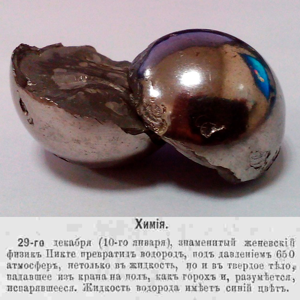 В 1935 году, Хиллардом Хантингтоном и Юджином Вигнером, теоретически был предсказан металлический водород. А уже в 1975 году, под руководством академика Л. Ф. Верещагина впервые в мире был получен металлический водород при давлении в 450 атмосфер. Во всяком случае так говорит википедия, и так считают многие современные... скажем так, образованные люди... Жаль, что ни Хантигтон с Юджином, ни академик Верещагин, не читали периодических журналов позапрошлого века. Поскольку 10 января, 1878 года, женевский физик Пикте, сжал водород давлением 650 атмосфер и получил металлический водород. то есть за 47 лет до того как металлический водород был только ПРЕДСКАЗАН, некий женевский, заметьте - ЖЕНЕВСКИЙ, физик, получил его физически. причем достигнув давления в полтора раза больше, чем академик Верещагин через сто лет. Кстати в 2017 году, физики из Гарвардского университета снова сообщили о том что они ВПЕРВЫЕ В ИСТОРИИ получили металлический водород... И снова они забыли и о Верещагине и о Пикт