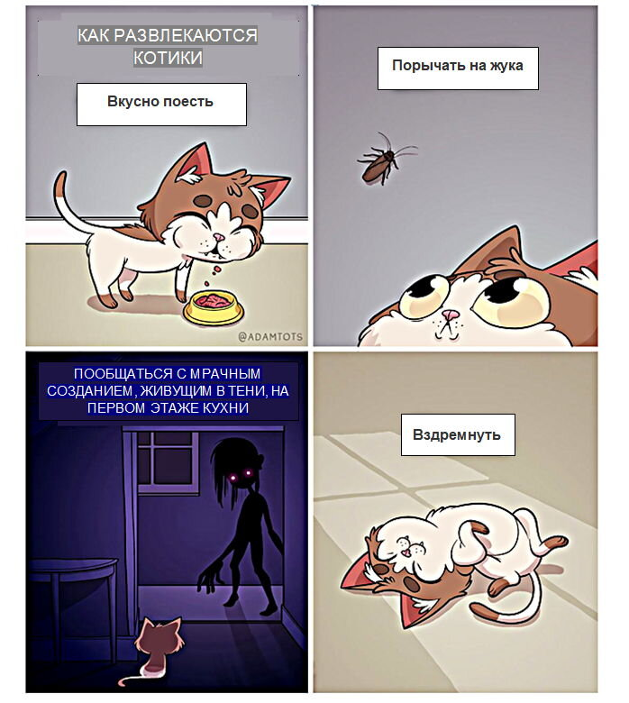 Американский карикатурист Адам Эллис известен в сети прежде всего своими юмористическими зарисовками. Например, на канале уже выходило несколько таких весёлых сборников. О жизни холостяка. О любви к аниме и видеоиграм. О замурчательных пушистиках (у автора живут три котяры и он обожает отправлять их в комиксы). Этот художник любит вкусно поесть и остроумно пошутить. В серии "Книга Адама", которая выходит с 2010 г немало популярных фантазийных историй, можно найти скетчи о чём угодно. Они довольно легкомысленные и пародийные. Например такой: Темой этого выпуска будут страшилки. В творчестве Адама Эллиса достаточно много профессионально выполненных жутких историй. Они способны напугать зрителя не обилием кровавых сцен или маньяков в масках. Нет. Это скорее мистика, необъяснимые встречи с потусторонними существами или загадочными явлениями и т.п. Мурашки и мандраж. Ощущение того, что объяснить логически то, с чем столкнулись персонажи истории сложно... Вот, что дают пугалки Эллиса. В прош