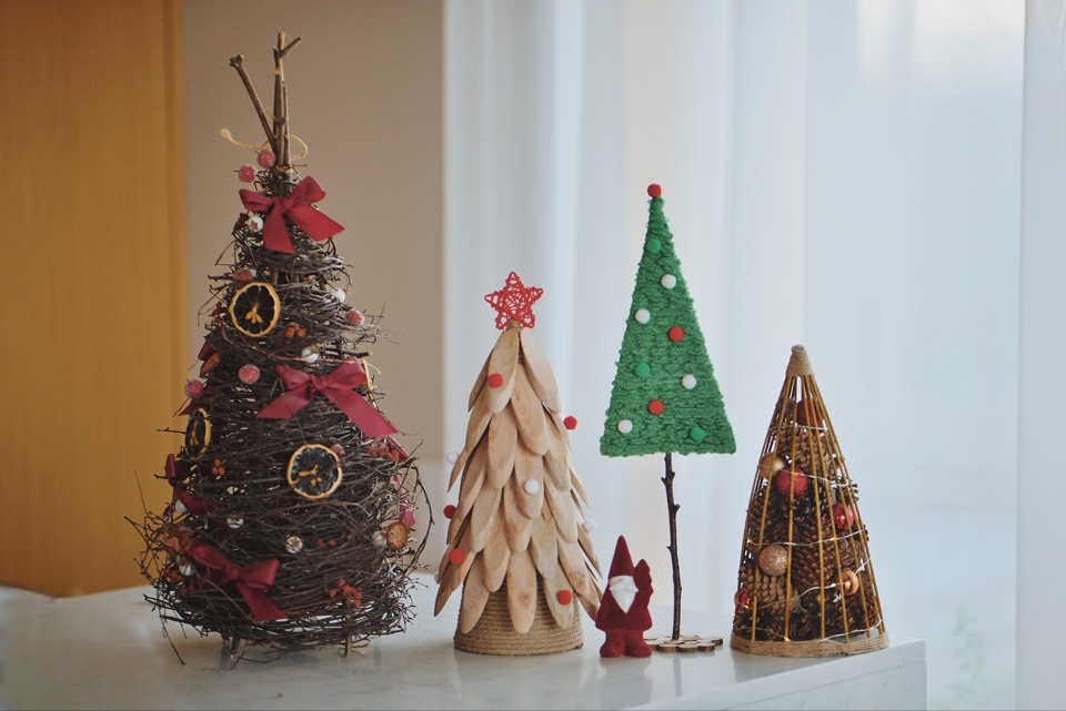 Итак, вырезаем из плотного картона от любой коробки (если у вас её нет, возьмите в Вайлдберриз) треугольник. Обматываем его нитками. Здесь можно взять любой цвет. Если у вас скандинавский интерьер, то берите пастельные тона от белого до шоколадного. Далее вставляем ножку-веточку и фиксируем её клеем. Для подставки я склеила между собой мини спилы, но можно взять только 1 побольше или обыкновенный короткий брусочек. Украшаем ёлочку декором. Это могут быть пуговицы, помпоны, шишки туи, любые декоративные украшения. Я купила эти мелкие мягкие шарики на Алиэкспресс. Но такие же продаются в магазине Леонардо (там же есть и спилы, нитки, клеевые пистолеты).