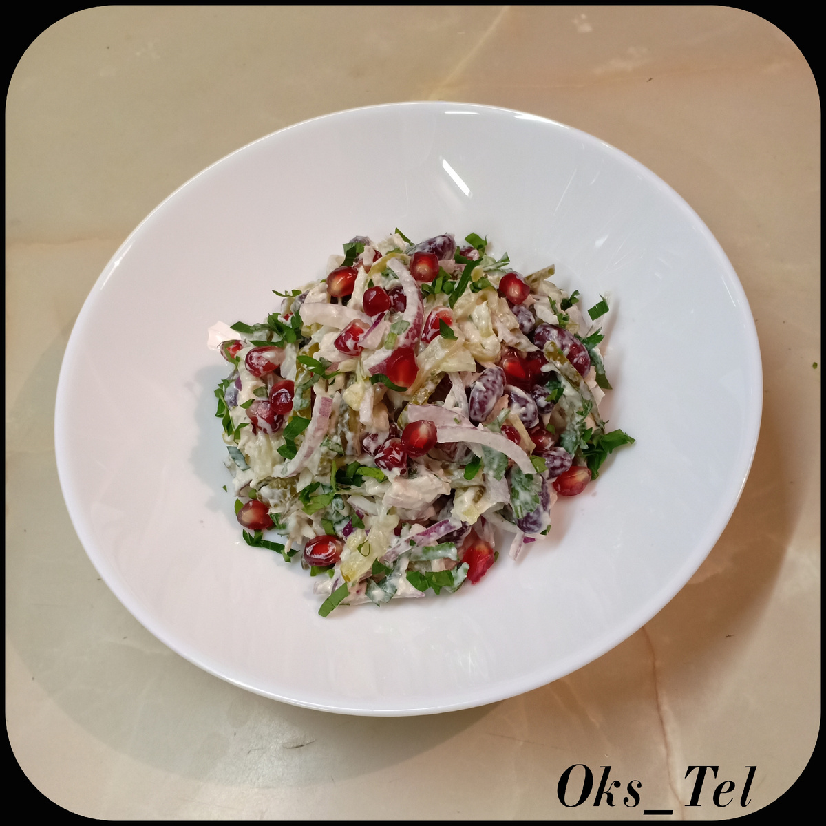 Мясной салат с гранатом, фасолью и маринованными огурчиками.