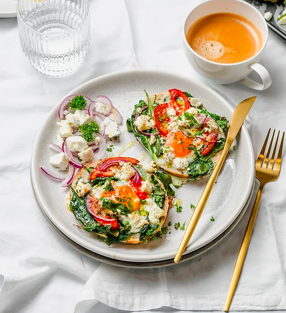 Делали вам в детстве такое блюдо? В нашем детстве родители обычно вырезали круглую дырочку в ломтике хлеба, клали его на сковороду и разбивали яйцо посередине. Они называли это "яйцо в хлебе", в разных странах это называют по разному "яйцом в гнездышке" или "жабой в норе" ЛОЛ!!! Попробуй этот рецепт, но без жарки хлеба и яйца. Этот забавный поворот традиционного завтрака с бубликом включает свежий шпинат, ломтики спелых помидоров, лук-шалот, сливочную фету и идеально запечённые яйца глазуньи.